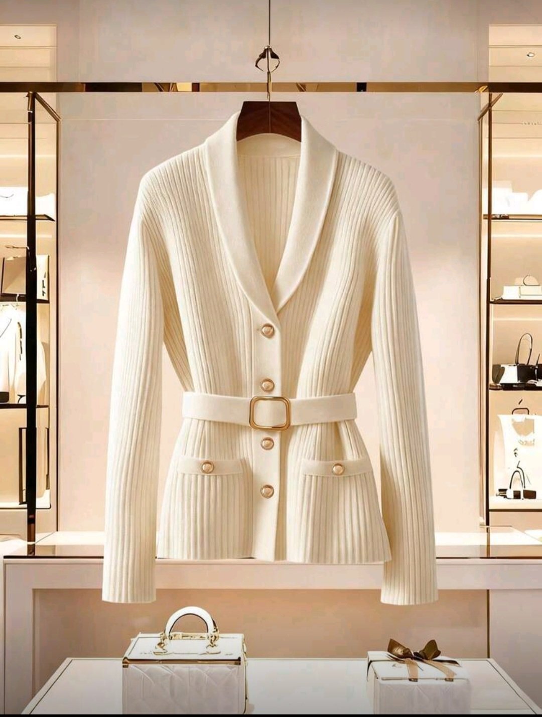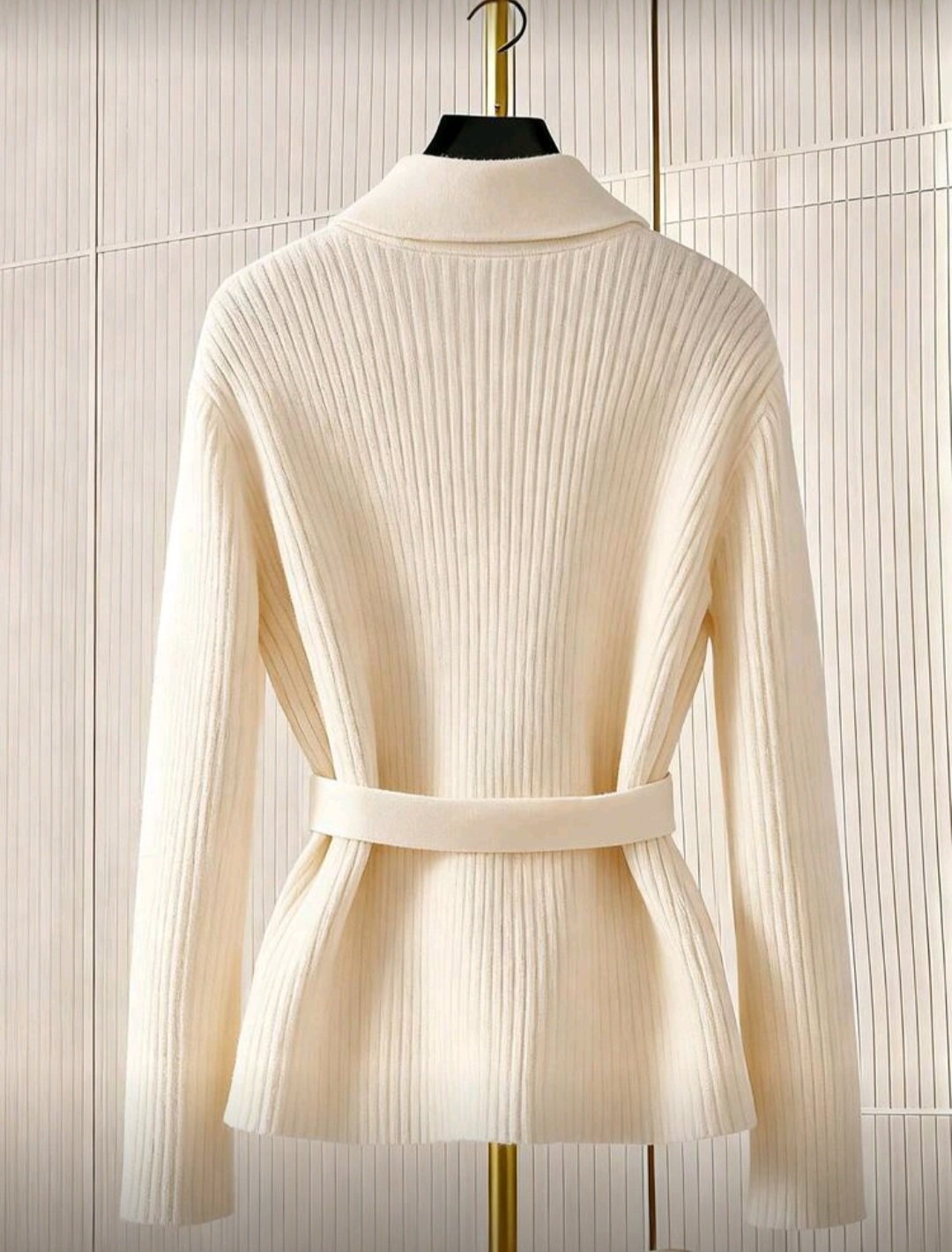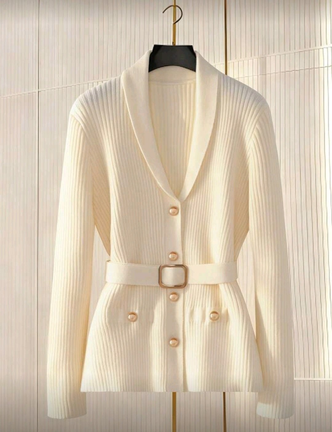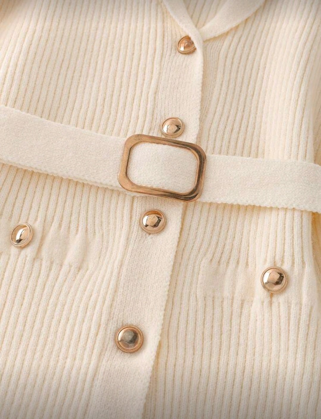 Chic beige belted knit cardigan with pearl buttons — perfect for an elegant look.
