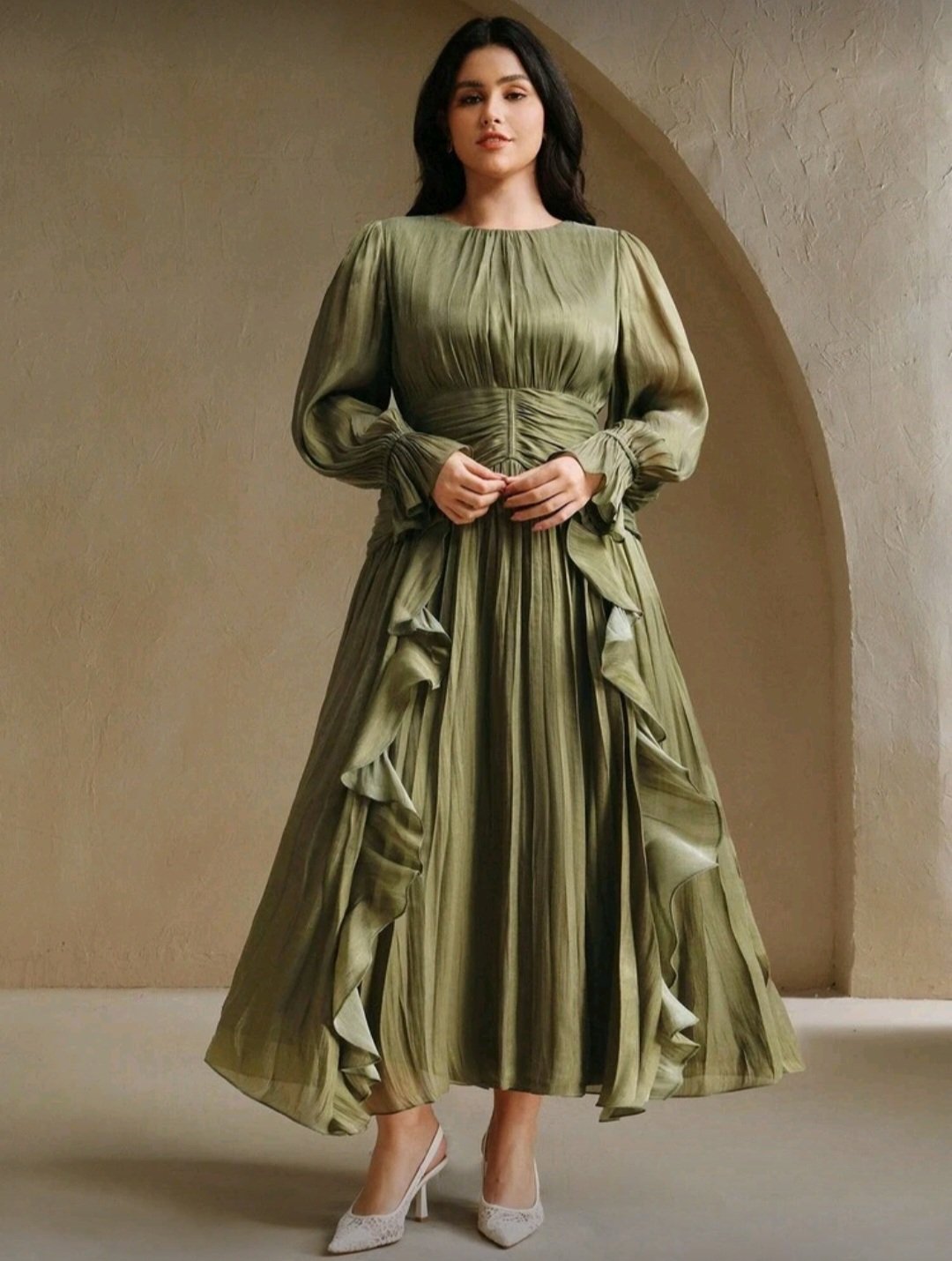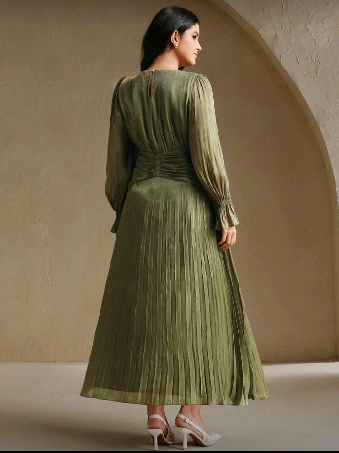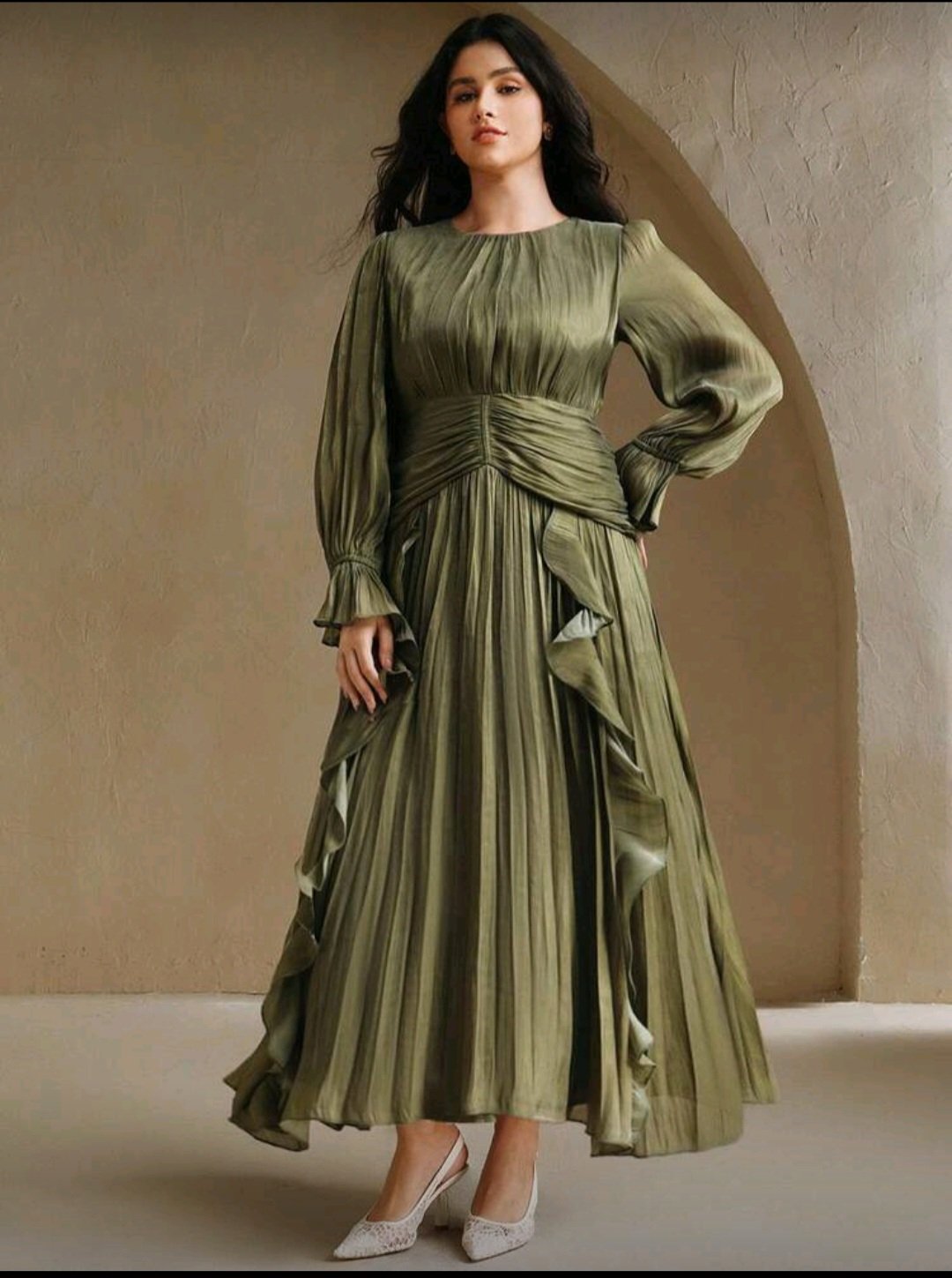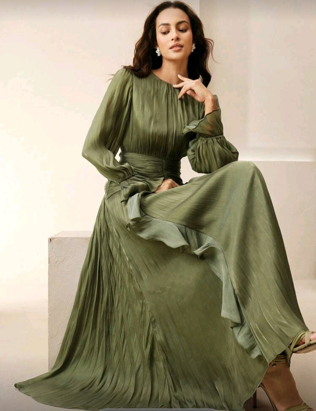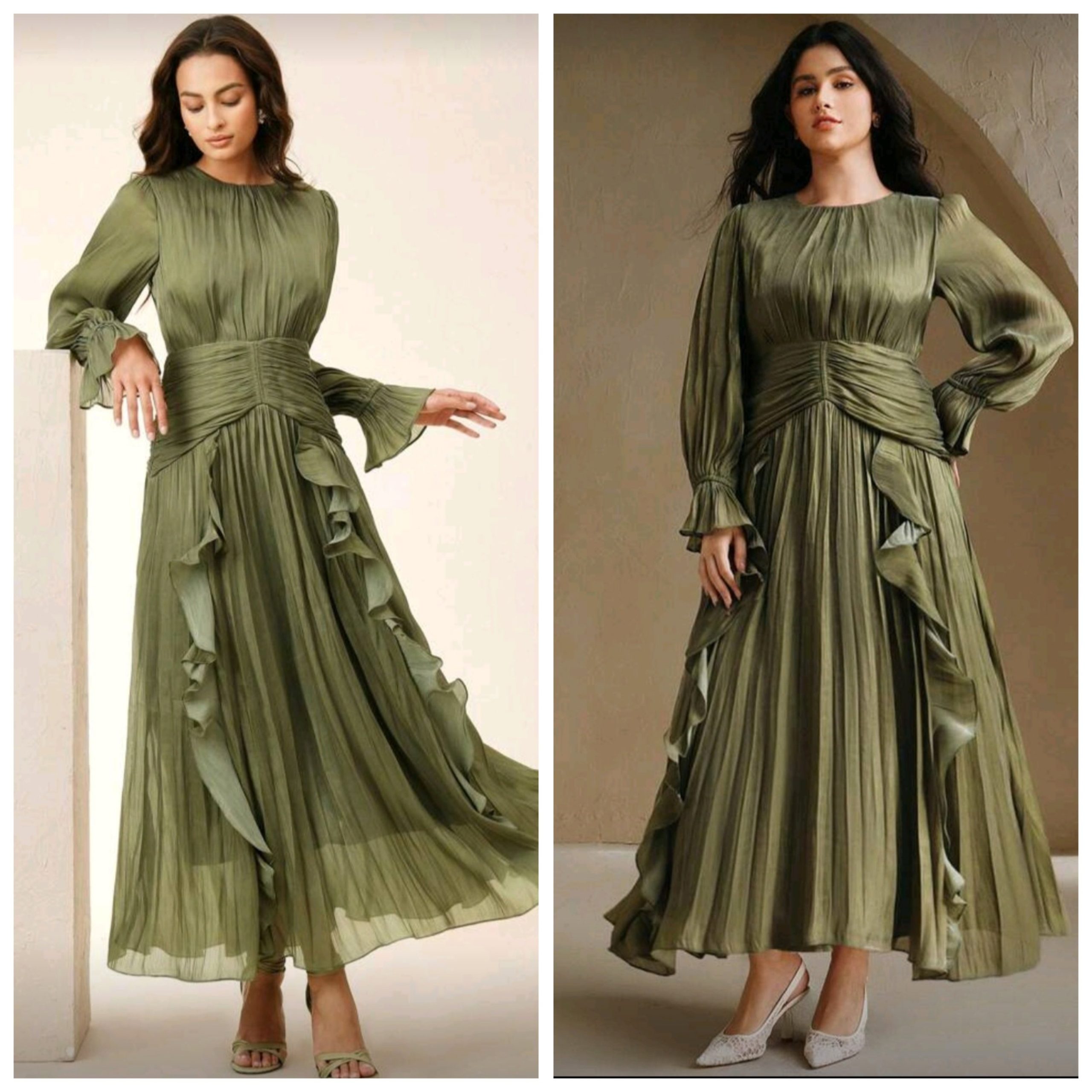 Elegant long olive green dress with green stone detail — perfect for special occasions.