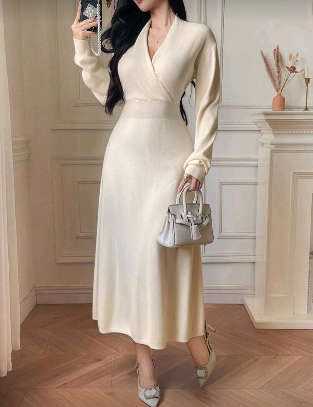 Elegant knit dress with a wrap design and V-neckline. Features a high waist, long sleeves, and a relaxed fit, perfect for evening events and special occasions. Soft, lightly stretchy fabric, ideal for colder seasons.
