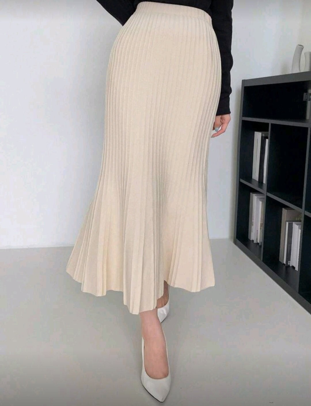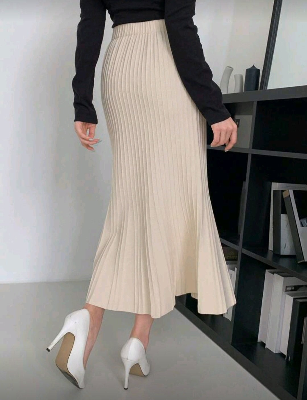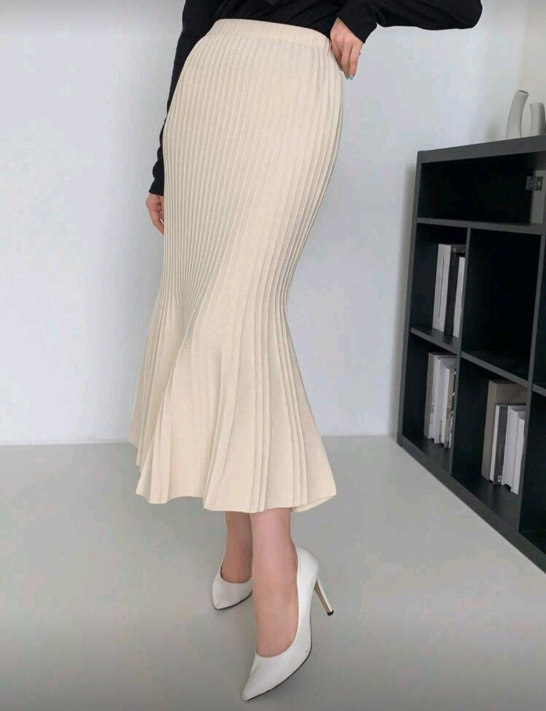 Elegant pleated midi knit skirt made from soft stretch fabric. Composition: 60% polyester, 40% viscose. Elastic high waist, slim fit top with flared hem. Suitable for cold season