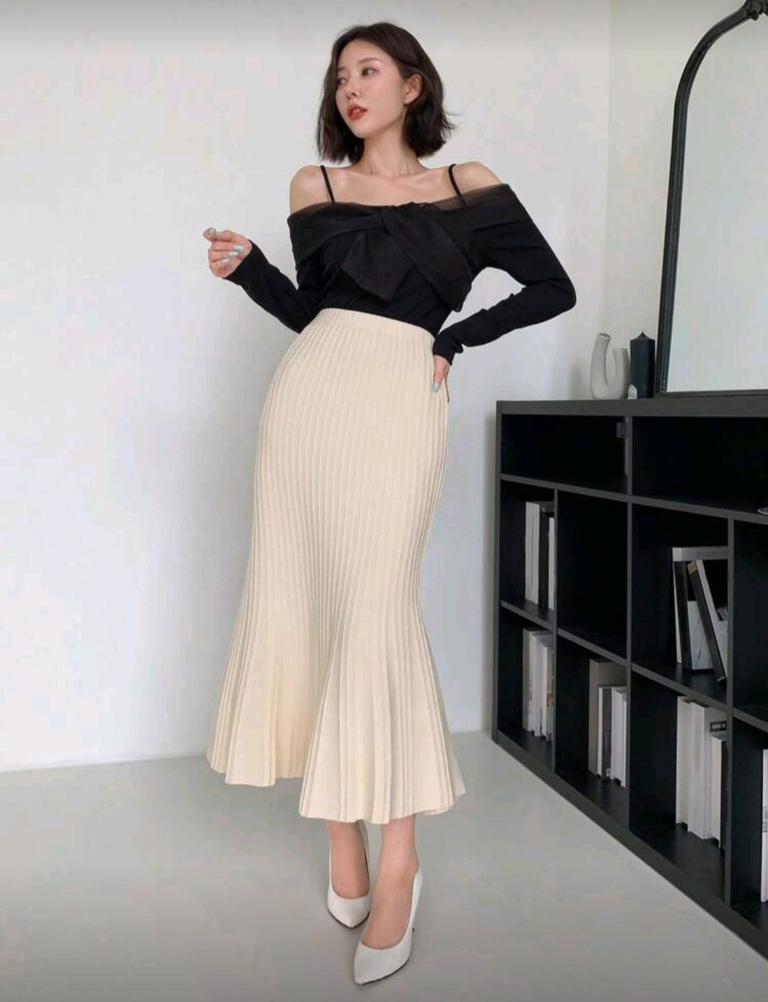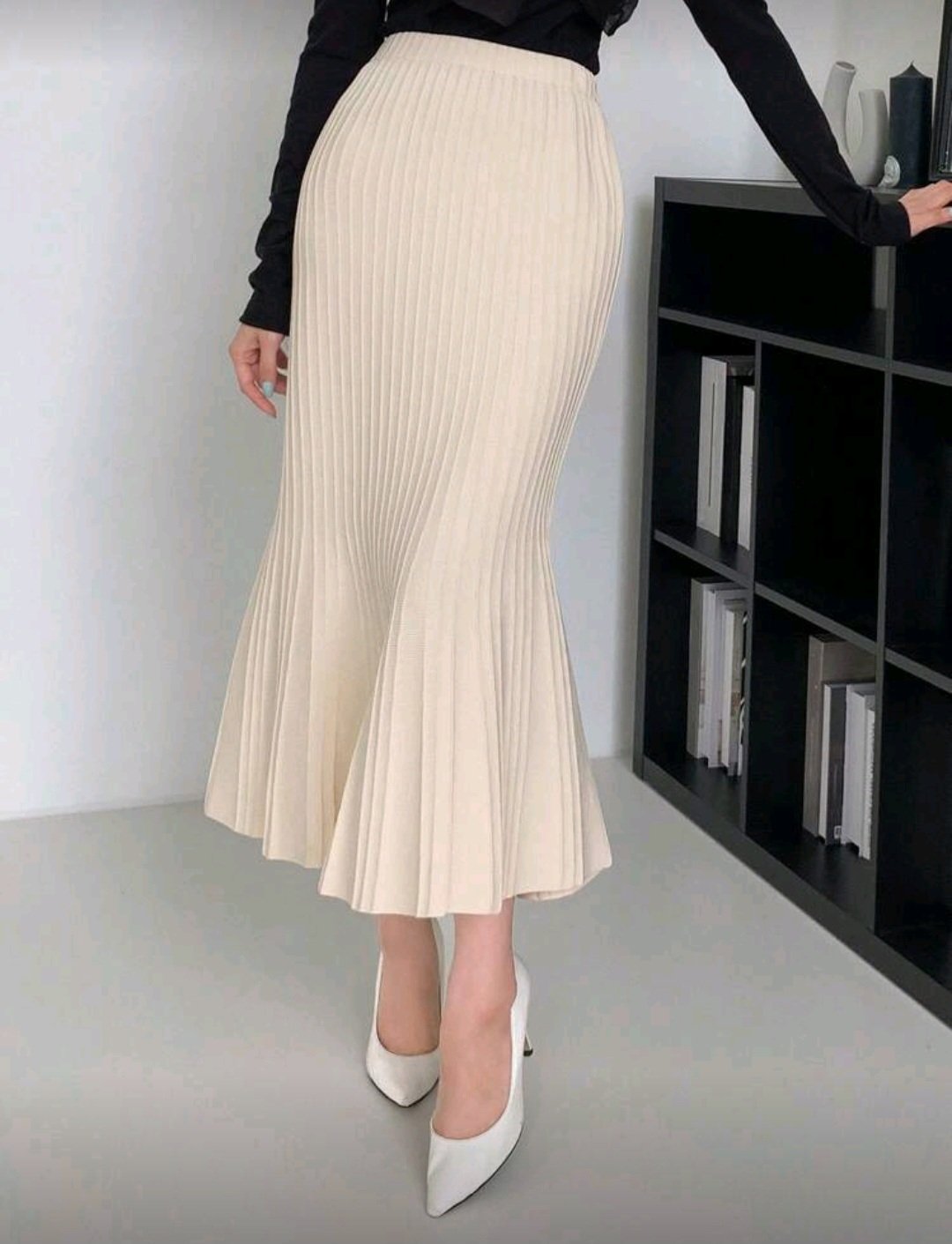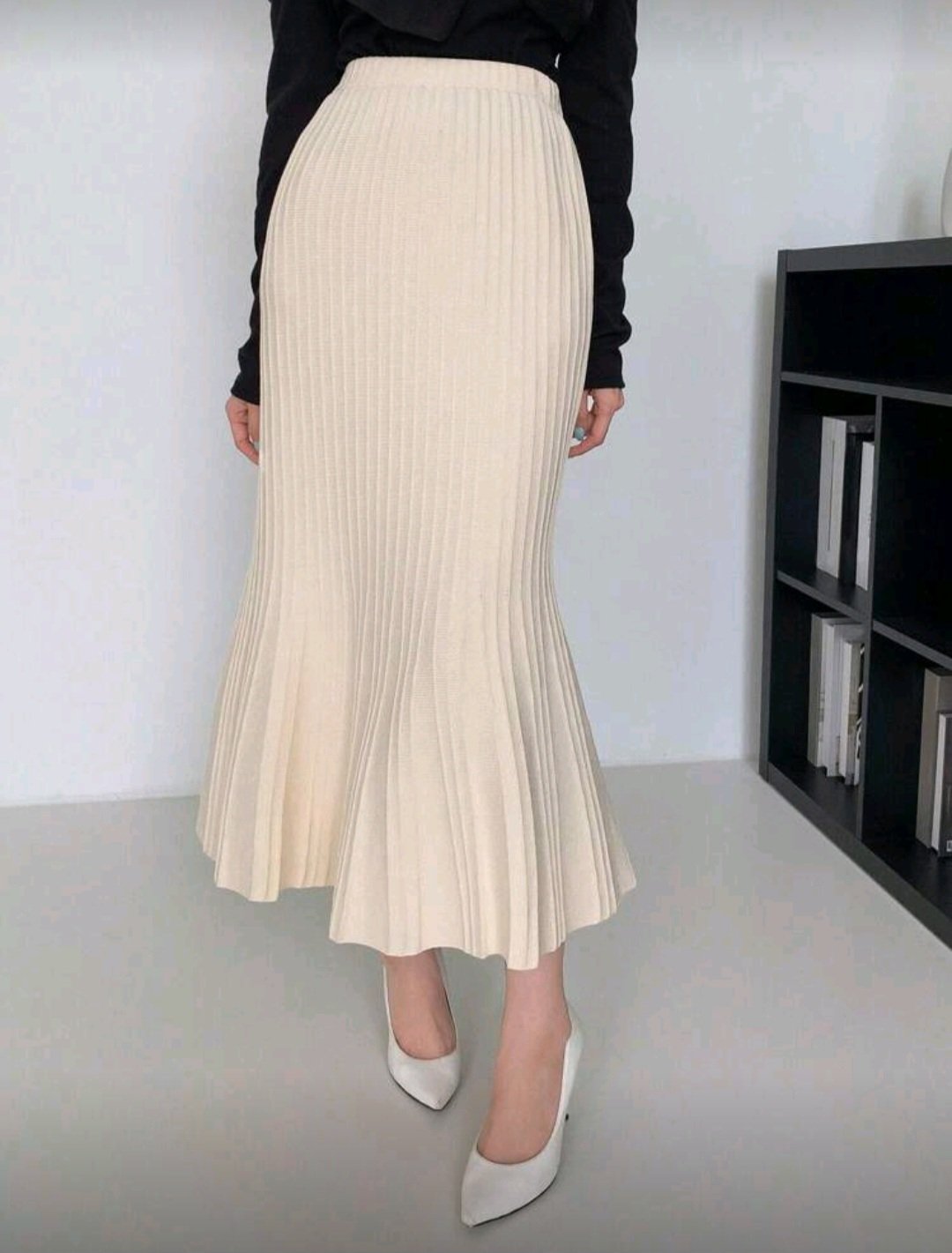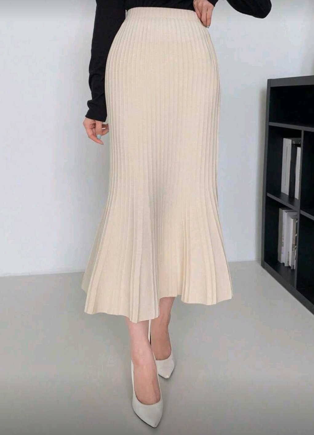Elegant pleated midi knit skirt made from soft stretch fabric. Composition: 60% polyester, 40% viscose. Elastic high waist, slim fit top with flared hem. Suitable for cold season