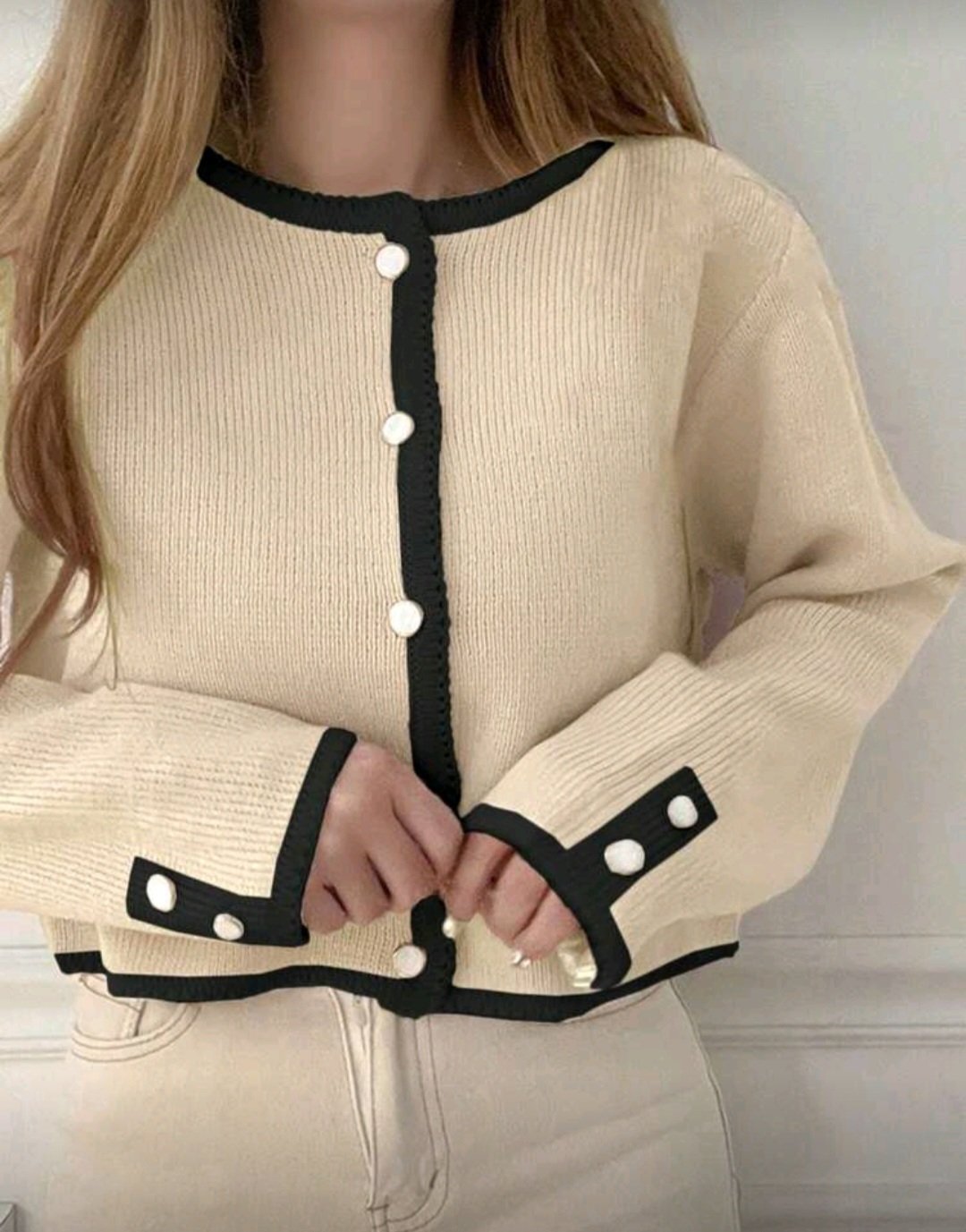 Womenβs white knitted cardigan with buttons and contrast trim.